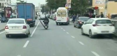 Motosikletlinin trafikte eşya taşıma yöntemi herkesi korkuttu