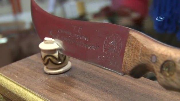 Sivas’da 23 yıldır özel bıçakların üretimini yapan 73 yaşındaki, Şirin Baba lakaplı Erdoğan Güzel, Guinness’e adam minik bıçaklarının ardından şimdi de Cumhurbaşkanı Recep Tayyip Erdoğan için özel bir bıçak üretti. Güzel bir hafta boyunca üzerinde çalıştığı özel Sivas bıçağını ilk fırsatta Cumhurbaşkanı Recep Tayyip Erdoğan’a hediye etmek istiyor. Üzerinde, Cumhurbaşkanı Erdoğan ismi, Cumhurbaşkanlığı forsu ve kurt figürlerinin bulunduğu bıçak dikkat çekiyor.
