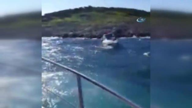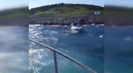 Muğla’nın Bodrum ilçesinde denize açılan 9 metrelik lüks yatın benzini bitince sürüklenmeye başladı. Şiddetli fırtına nedeniyle kayalıklara doğru sürüklenen yatın imdadına o an yakınlarda bulunan tur teknesi kaptanı ve çalışanları kurtardı.