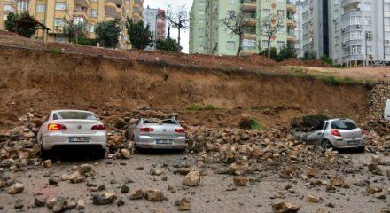 Adana'da, yoğun yağışın etkisiyle bir sitenin istinat duvarının çökmesi sonucu park halindeki kapalı kasa bir kamyonet ile 3 otomobilde hasar oluştu.