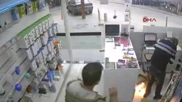 Bursa’nın İnegöl ilçesinde, telefon tamircisi Ayhan Şahin, tamir ettiği cep telefonunun bataryasının patlayarak alev almasıyla yaralandı. Olay anı iş yeri güvenlik kamerasına yansıdı.