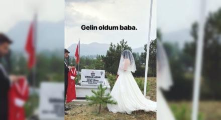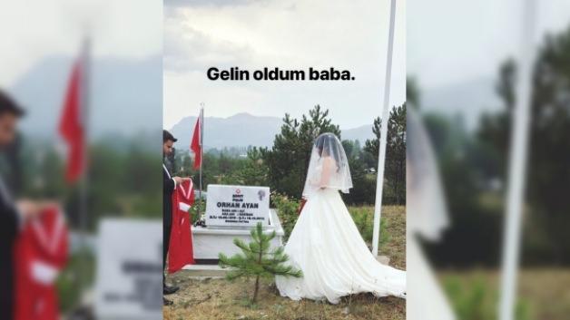 Mardin'de şehit olan polis memuru Orhan Ayan'ın kızı Büşra Ayan, gelinliğiyle babasının mezarını ziyaret etti. "Gelin oldum baba" diyen Büşra Ayan babasının mezarına Türk bayrağı astı, helallik istedi..