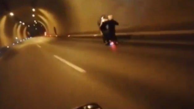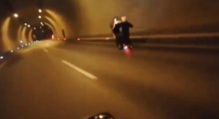 Beykoz Halil Ulukurt Tüneli içerisinde tek tekerlek üzerinde metrelerce giderek trafiği tehlikeye atan motosikletli maganda, dengesini kaybedince kaza yaptı. O anlar ise kameralara yansıdı.