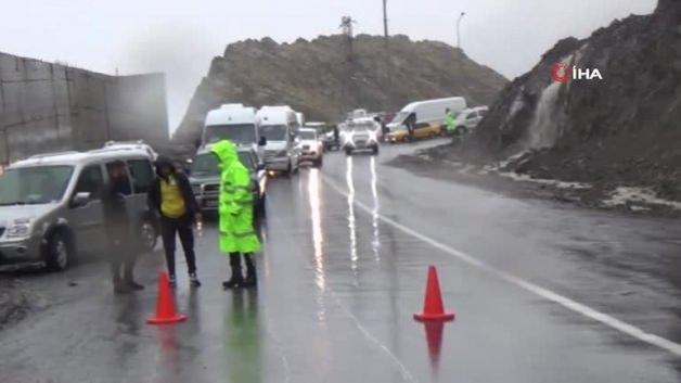 Hakkari’de etkili olan karla karışık yağmur nedeniyle dağdan kopan dev kaya kütleleri karayolunu çift yönden trafiğe kapattı.