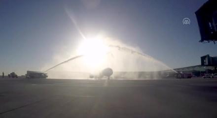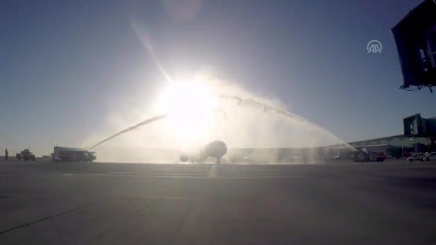 Çin'in pandalarıyla ünlü kenti Chengdu'ndan kalkan Sichuan Havayolları'nın Airbus 330 tipi uçağı, 254 yolcusu ile İstanbul'a geldi. İstanbul Havalimanı'na inen uçak su takı ile karşılanırken yolculara da inişte çiçek verildi.