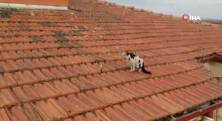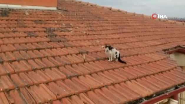 Mahallede oturan ve 48 saattir kedinin çatıda mahsur kaldığını belirten İbrahim Efe, "Kediyi iki gündür gözetliyoruz, bakıyoruz ama bir türlü aşağıya inemedi. Nereden çıktıysa bilmiyoruz, biz de en son itfaiyeyi aradık" dedi.