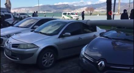 İzmir’in Konak ilçesinde 25 metrelik aydınlatma direği, kuvvetli rüzgar nedeniyle park halindeki araçların üzerine devrildi.