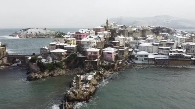 Amasra Kalesi ile 2015'te UNESCO Dünya Mirası Geçici Listesi'ne eklenen Bartın'ın Amasra ilçesi, kar yağışıyla beyaza büründü.