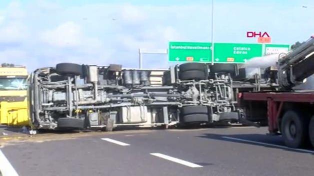 Kuzey Marmara Otoyolu 16. viyadüğü Uskumruköy mevkisinde Ankara istikametine seyir halindeki Fatih G. idaresindeki 34 LZ 0948 plakalı vinç, bariyerlere çarptıktan sonra devrildi.