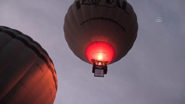 Göreme Kasabasından havalanan sıcak hava balonlarına Türkçe ve İngilizce '8 Mart Dünya Kadınlar Günü Kutlu Olsun' pankartları asıldı.