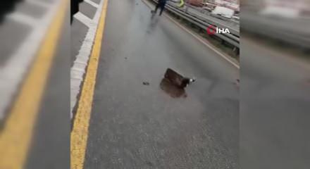 Küçükçekmece’de seyir halinde olan metrobüsten yola parça düştü. Yolcular arıza yapan metrobüsten inip yürümek zorunda kaldı. Yaşanan ilginç olay kameraya yansıdı.