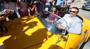Eski Devlet Bakanı Kürşat Tüzmen ile sinema sanatçıları Tarık Tarcan ve Çoşkun Göğen, Türkiye'nin ilk elektrikli spor otomobili ile Antalya caddelerinde tur attı.