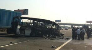 Çin'de bir TIR'labir otobüs çarpıştı. Çarpışma ile alev alan tobüste bulunan 5'i Alman turist toplam 6 kişi cayır cayır yandı.