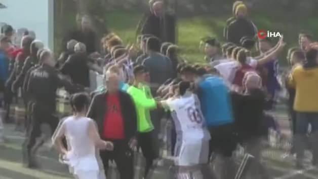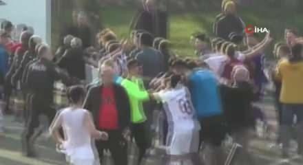 Sakarya’da Süper Amatör Lig’de oynanan müsabakada son düdüğün ardından kavga olaylar çıktı. Yeşil sahanın adeta boks ringine döndüğü o anlar saniye saniye böyle kaydedildi.