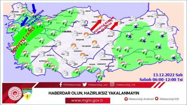 Rüzgarın bugün Marmara’nın kuzeyinde kuzeyli, Orta Karadeniz’in iç kesimlerinde güneyli yönlerden yer yer kuvvetli (40-60 km/saat) esmesi beklendiğinden yaşanabilecek ulaşımda aksamalar, çatı uçması, ağaç ve direklerin devrilmesi, soba ve doğalgaz kaynaklı baca gazı zehirlenmesi gibi olumsuz şartlara karşı dikkatli ve tedbirli olunm