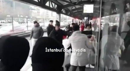 İstanbul'da Beylikdüzü metrobüs durağında yolculuları dehşete düşüren bir kavga yaşandı. Onlarca kişinin dahil olduğu kavganın sebebi bilinmezken, durakta bekleyen yolcular kaçacak yer aradı.