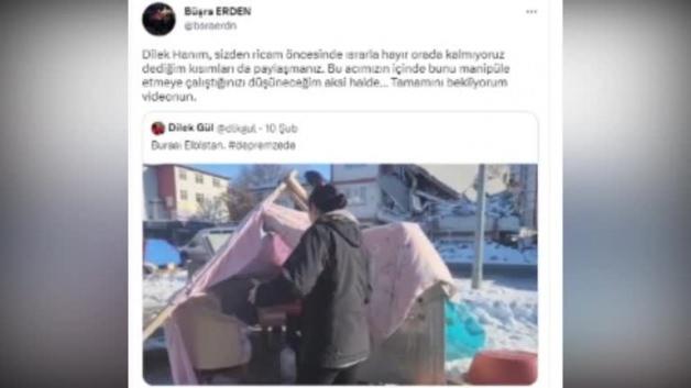 Sosyal medyadan açıklama yapan Büşra Erden isimli vatandaş, kendisinin ısrarla orada kalmadığını söylemesine rağmen Euronews muhabiri Dilek Gül'ün yalan ifadeler kullandığını belirtti. Orada kalmadıklarını ifade eden depremzede vatandaş, muhabire şu ifadelerle videonun tamamını yayınlama çağrısında bulundu: