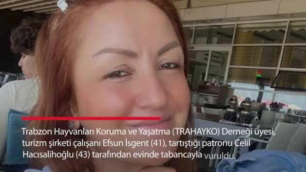 Trabzon Hayvanları Koruma ve Yaşatma (TRAHAYKO) Derneği üyesi, turizm şirketi çalışanı Efsun İsgent (41), tartıştığı patronu Celil Hacısalihoğlu (43) tarafından evinde tabancayla vuruldu.