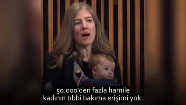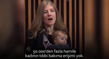 Kanada'da Yeni Demokrat Milletvekili Laurel Collins parlamentoda bebeği kucağında bir şekilde Gazze için çağrı yaparak şu ifadeleri kullandı;