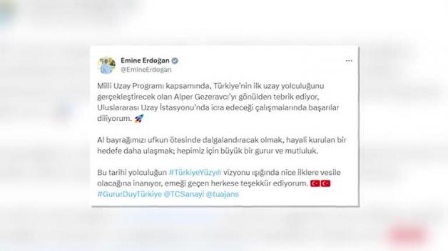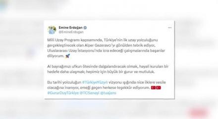 Cumhurbaşkanı Recep Tayyip Erdoğan'ın eşi Emine Erdoğan, Türkiye'nin ilk uzay yolcusu Alper Gezeravcı'yı tebrik ederek, Uluslararası Uzay İstasyonu'nda yapacağı çalışmalarda başarılar diledi.