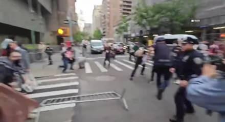 Manhattan'daki bir caddede toplanan ve Filistin bayrakları taşıyan daha kalabalık bir grup ise Gazze sloganları atarak, İsrail'in Gazze saldırılarını durdurmasını talep etti.