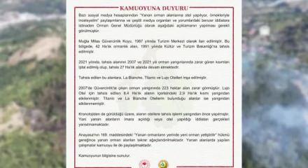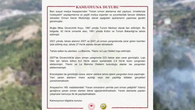Tarım ve Orman Bakanlığı Orman Genel Müdürlüğü (OGM), bazı sosyal medya hesapları ve medya organlarında "Yanan orman alanlarına otel yapılıyor" şeklinde yer alan iddiaların gerçeği yansıtmadığını bildirdi.