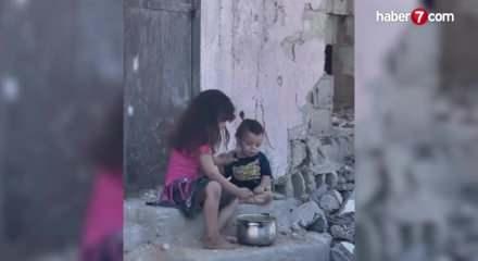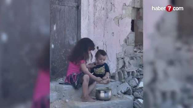 İsrail’in saldırılarında yıkılarak viraneye dönen evinin önünde minik kardeşini doyuran yetim Gazzelinin giyecek ayakkabısının dahi olmadığı görüntülere yansıdı.