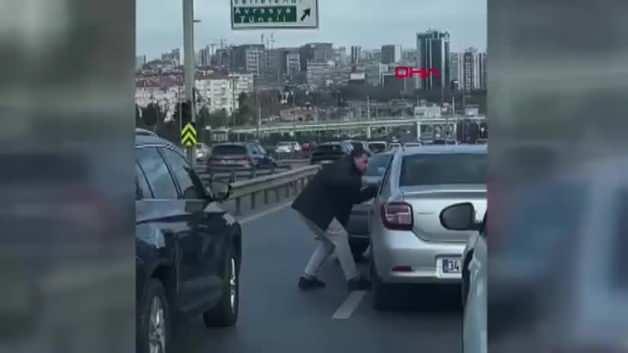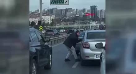 Bakırköy'de D-100 Karayolu'nda tartışan iki sürücü, kavga edip araçla yol keserken, olay vatandaşların müdahalesiyle sona erdi ve cep telefonu kamerasına yansıdı.