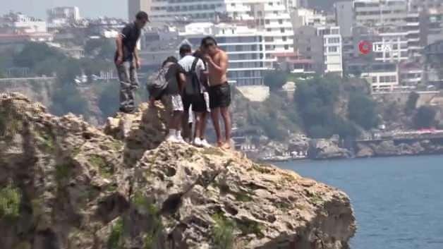 Antalya'nın dünyaca ünlü Konyaaltı Sahili'nde havaların ısınması ile birlikte özellikle hafta sonları yoğunluk yaşanıyor. Konyaaltı Sahili'nden yaklaşık 30 metrelik falezler manzarasıyla görenleri büyülerken adrenalin tutkunu gençlerin tehlikeli eğlencesine de sahne oluyor.
