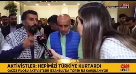 Türkiye’ye dönen aktivistlerden gazeteci Ersin Çelik, İstanbul Havalimanı’nda yaptığı açıklamada, İsrail askerlerinin çevre aktivisti Greta Thunberg’e ağır işkencede bulunduğuna şahit olduklarını aktardı. Çelik, “Greta’ya çok ağır işkence yaptılar, zulmettiler. Onu süründürdüler İsrail bayrağını öptürdüler. Nazilerin yaptıklarını yaptılar. Onu ortada bir yerde sergilediler. Onlar henüz bırakılmadı.” dedi.