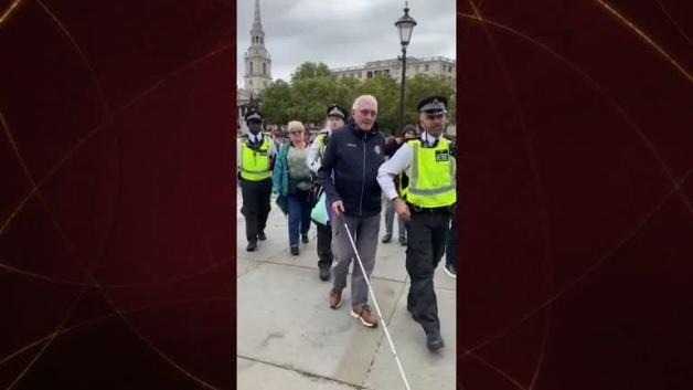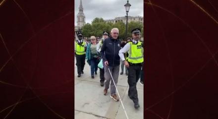 Göstericilere müdahalede bulunan İngiliz polisinin görme engelli yaşlı adamı tutukladığı o anlar gündem oldu.