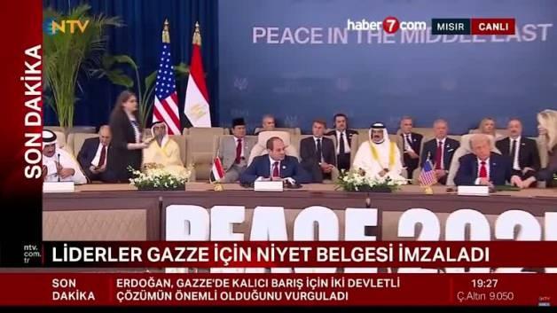 Fotoğraf çekiminin ardından ABD Başkanı Trump, Mısır Cumhurbaşkanı Sisi, Katar Emiri Al-Sani ve Cumhurbaşkanı Erdoğan, Gazze için "Niyet Belgesi"ni imzaladı.