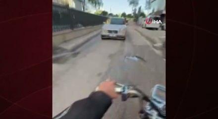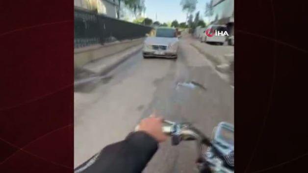 Bu sırada motosiklet sürücüsünün, "Ters yön, beni canımdan mı edeceksin" demesi üzerine otomobil sürücüsünün, "Trafik polisi misin? Canından olma bekle, istediğim yerden girerim" sözleri pes dedirtti.
