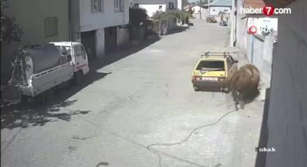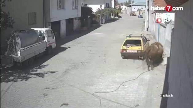Nevşehir’de zincirinden kurtularak ahırdan kaçan kızgın boğa, hırsını cadde üzerinde park halindeki otomobilden çıkarttı. O anlar güvenlik kamerasına yansıdı.