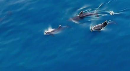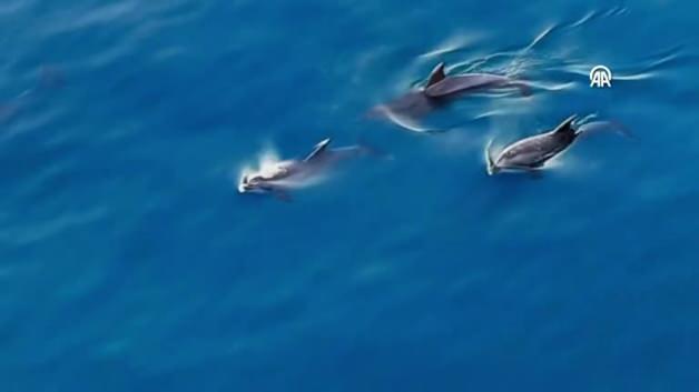 Sinop'un Gerze ilçesi açıklarında su yüzeyine çıkan yunuslar renkli görüntüler oluşturdu o anlar dron kamerasıyla görüntülendi.