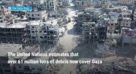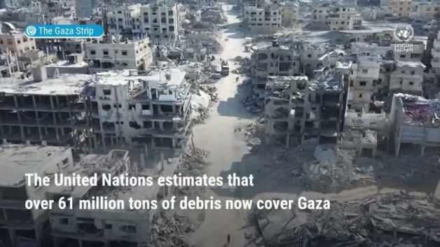 Katil İsrail'in Gazze'de yol açtığı yıkımı da gösteren bir video paylaşan UNRWA, Gazze Şeridi'nin geniş alanları kaplayan 61 milyon ton enkazla kaplandığını aktardı.