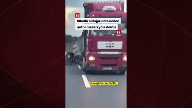 Kuzey Marmara Otoyolu'nda bir tırın zikzak çizerek ilerlemesi ve dorsesindeki yüklerin yola savrulması cep telefonu kamerasıyla kaydedildi.