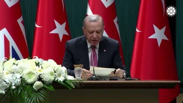 Cumhurbaşkanı Recep Tayyip Erdoğan: "(Birleşik Krallık) Ticaret hacmimizi ilk etapta 30, ardından 40 milyar dolara çıkarma kararlılığındayız. Ekonomik ilişkileri güçlendirme hususunda kararlıyız."