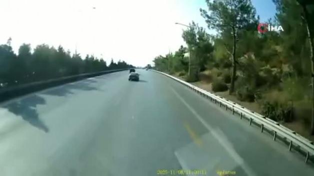 Mersin'de seyir halindeki bir otomobil, otobanda sol şeritte duran başka bir araca çarptıktan sonra bariyerlere savruldu. Kazada yaralanan olmazken, o anlar başka bir aracın kamerasına yansıdı.