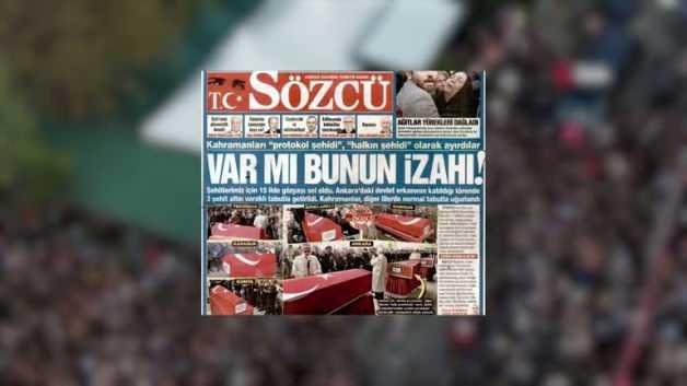 Şehitlerin mukaddesatına saldıran Sözcü, devletle milleti bölmeye kalktı. Resmi katılımlara rağmen Ankara dışındaki cenazeleri 'halkın şehidi' diye niteledi. Ankara'daki cenaze için 'protokole özgü varaklı tabut' yalanını manşet yaptı.