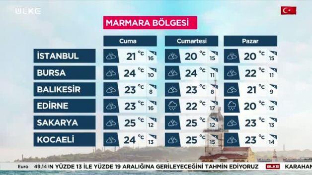 Ülke genelinde kuzey, iç ve batı kesimleri parçalı yer yer çok bulutlu, gece saatlerinde Güney Ege kıyıları ile Balıkesir'in batı ilçelerinin yerel sağanak yağışlı, diğer yerlerin az bulutlu ve açık geçeceği tahmin ediliyor. Rüzgarın; Marmara'nın batısı ile Kuzey Ege kıyılarında güney ve güneybatı yönlerden kuvvetli (40-60 km/saat), Trakya'da yer yer kısa süreli fırtına (50-70 km/ saat) şeklinde esmesi bekleniyor. Sabah ve gece saatlerinde Doğu Anadolu ile Güneydoğu Anadolu'nun kuzeyinde pus ve yer yer sis bekleniyor.