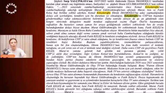 İtirafçı işadamı Sarp Yalçınkaya’nın iddianameye yansıyan ifadesine dikkat çeken Bahar Feyzan, İmamoğlu’na en yakın isimlerden Fatih Keleş’in, firari işadamı Murat Gülibrahimoğlu’na “Ekrem İmamoğlu'nun cumhurbaşkanı olacağını ve bu sayede bütün finansal imkanların kendilerine yöneleceğini söylediği” bölümden alıntı yaptı.