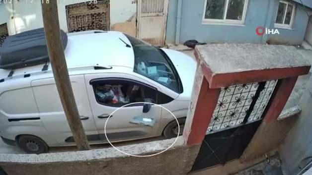 Adana’da kargocunun aracından inmeden müşterinin kargosunu bahçeye fırlattığı anlar güvenlik kamerasına yansıdı.