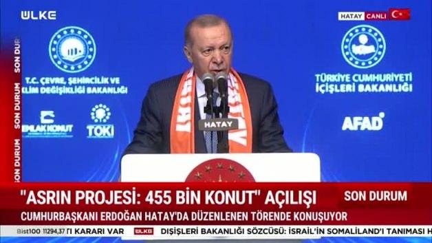 Cumhurbaşkanı Recep Tayyip Erdoğan, Hatay'da gerçekleştirilen "455 Bininci Afet Konutu Kura Çekimi, Anahtar Teslimi ve Yapımı Tamamlanan Yatırımların Toplu Açılış Töreni"ne katılarak vatandaşlara hitap etti. Deprem bölgesindeki yeniden inşa çalışmalarına değinen Erdoğan, muhalefete yönelik sert eleştirilerde bulundu ve verilen sözlerin tutulmasının gururunu yaşadıklarını ifade etti.