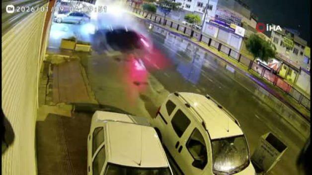 Adana'da yağan yağmur sonrası kayganlaşan yolda kontrolden çıkan otomobil park halindeki 4 araca çarptı, kaza anı anbean güvenlik kamerasına yansıdı.