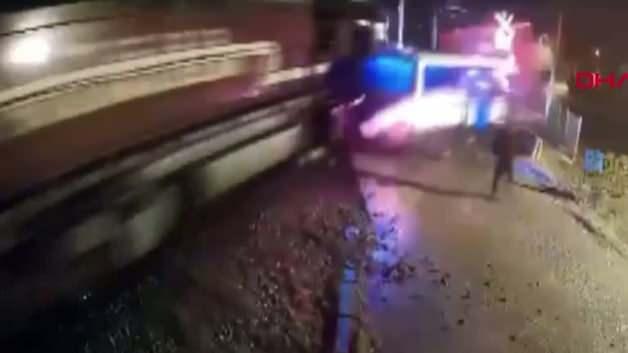 Tonlarca ağırlıktaki trenin geldiğini gören sürücü canını son anda araçtan inerek kurtardı.