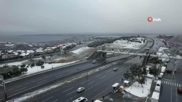 İstanbul'da gece saatlerinde etkili olan kar yağışı sonrası Beylikdüzü beyaza büründü; o anlar havadan görüntülendi.