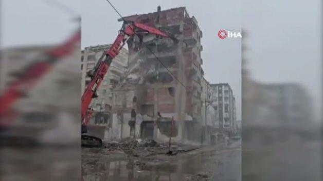 Diyarbakır’ın merkez Bağlar ilçesinde ağır hasarlı bina, yıkım esnasında 30 saniyede çöktü.