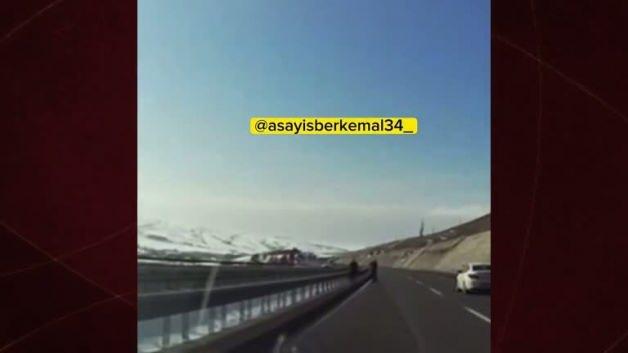 Otoyolun sol şeridine geçerek fotoğraf çektirmek isteyen iki kişi, kendilerini son anda fark edip uyaran sürücüye “Abi senlik bir şey yok, devam et” diyerek tepki gösterdi. Tehlikeli anlar anbean kaydedildi.