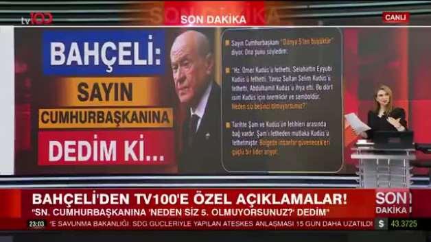 MHP Genel Başkanı Devlet Bahçeli gündeme ilişkin son dakika açıklamasında bulundu. Kudüs ile ilgili çok konuşulacak mesajlar veren Bahçeli, 4 isim sayarak Başkan Erdoğan'a 'Neden siz beşinci olmuyorsunuz?' dediğini ifade etti.